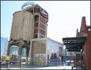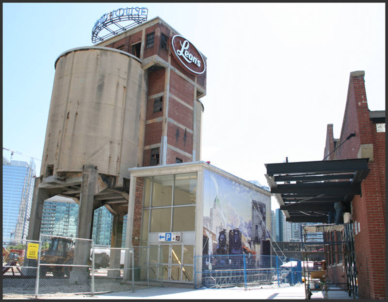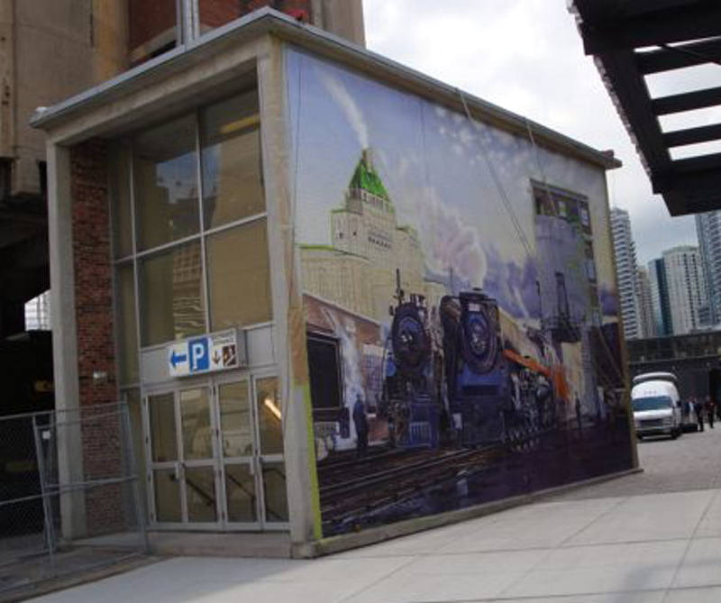 One of the new additions to Roundhouse Park is a mural on the side of the structure which houses the main stairwell to the underground parking garage of the Metro Toronto Convention Centre and opposite the main entrance to Leon’s. This mural is based on David A. Oram’s painting called “A John St. Morning”. In the pictures above, the mural was not as yet complete but the actual mural is now complete and well worth a visit.