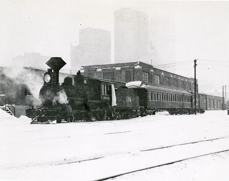 Recently, we published a series of excerpts here from an article by Derek Boles, TRHA’s historian, on Pierre Berton’s National Dream books about the development of the CPR. Featured in the TV series associated with the book was CPR steam engine #136. While doing research for an upcoming article on railfan organizations, Derek Boles came across this image of ex-CPR No. 136 at John Street in December 1973. The train was apparently being prepared for shooting the winter troop transport sequences in the National Dream television series. This view is looking northeast and the first of the bank towers can just be made out through the snow. The Stores Building behind the train was demolished around 1996.