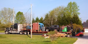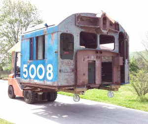 Continuing the saga of Bill Kaufman’s “big move”, we catch up with the Dash-9 cab and other bits as they arrive at Bill’s new home in Alabama. At both ends of the trip, fork lifts proved indispensable for moving the large bits of the cab.