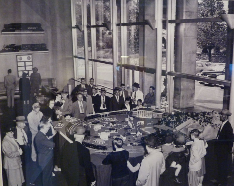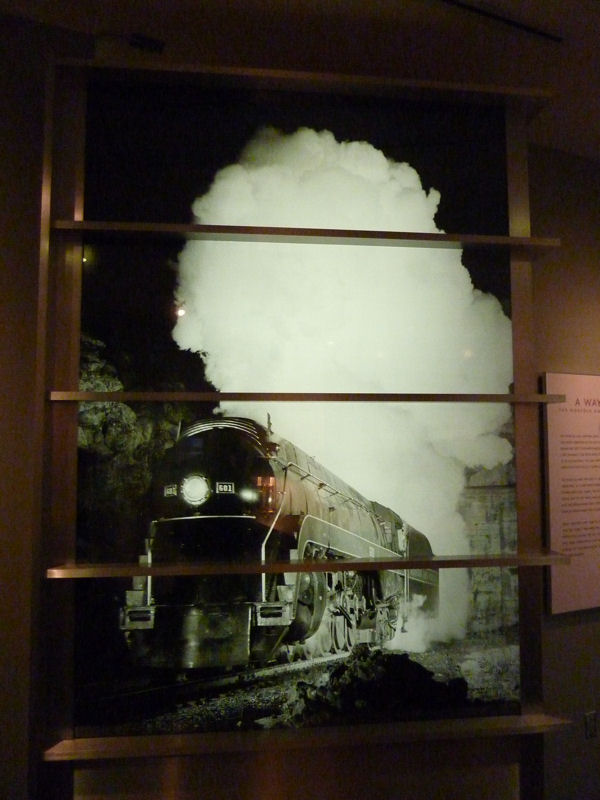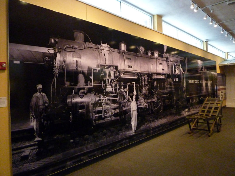 The main display area of the museum is in the basement of the station where passengers used to congregate to board the trains which arrived at this level. As shown in the lower right image, that trackside wall of the museum is covered by an enormous photograph of an N&W steam engine.