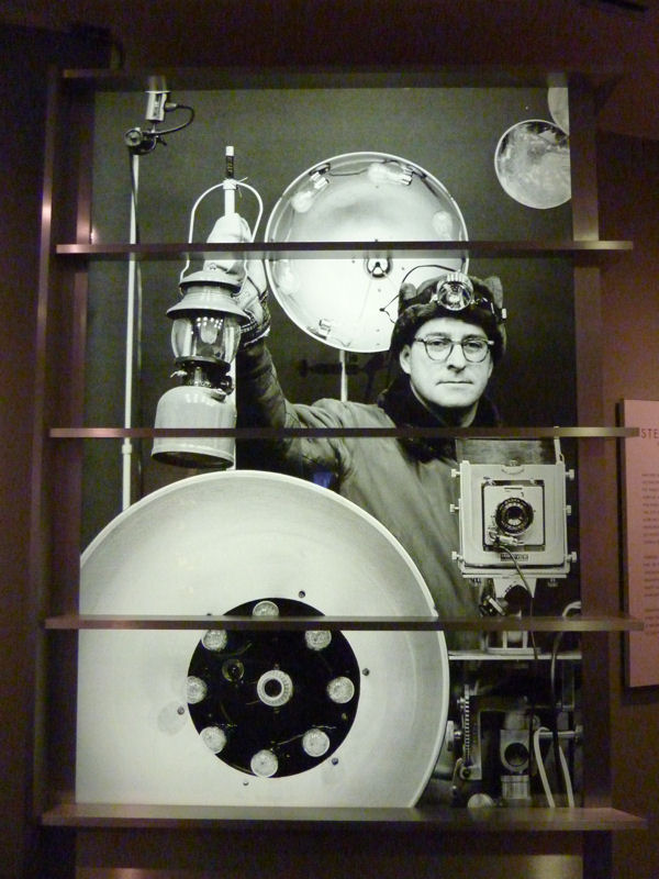 The O. Winston Link Museum is appropriately housed in Roanoke’s former passenger train station. The top floor which is at street level houses a tourist visitor’s centre, a museum foyer and the museum’s gift shop. At the upper right, we see a picture of a seasonal model railroad display in the main entrance of the station when the station was operational. The main foyer features a number “windows” dramatically presenting a few of his images as shown at the lower left and middle. The middle image is a self portrait of O. Winston Link with his complex photographic setup.