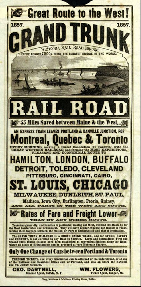 The Grand Trunk had quickly evolved into the most important railway in Canada, connecting the east coast of the United States with Montreal, Toronto and eventually Chicago. The illustration at teh left is an 1857 handbill advertising the railway’s routes and services although most of the U.S. destinations highlighted were only reached by other connecting railways. Also shown is an illustration of the Victoria Bridge in Montreal, the first bridge over the St. Lawrence River, then under construction. On June 21st, 1858, the Grand Trunk opened Toronto’s first Union Station on reclaimed land about 200 feet west of York Street halfway between Front Street and today’s Bremner Boulevard. It was by later standards a modest frame structure built of wood, although at the time Torontonians were thrilled with the new station. The GTR shared the facility with the Great Western Railway and the Northern Railway of Canada (renamed from the Ontario, Simcoe & Huron Railway).