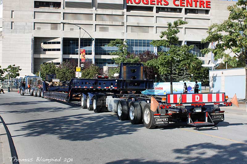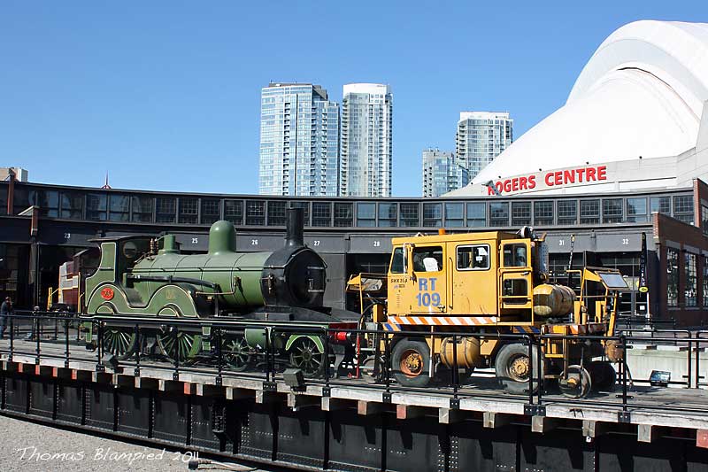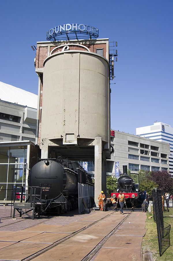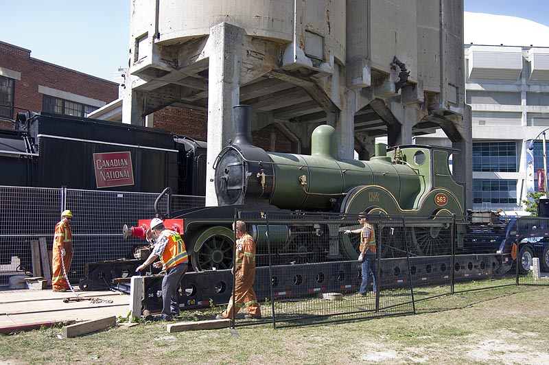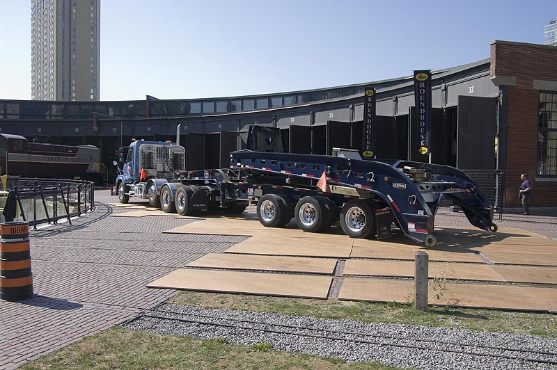In these images we see the arrival of the float which was used to carry the steam engine as well as the engine being moved to the track beside the coaling tower where the float was positioned.
