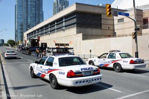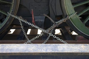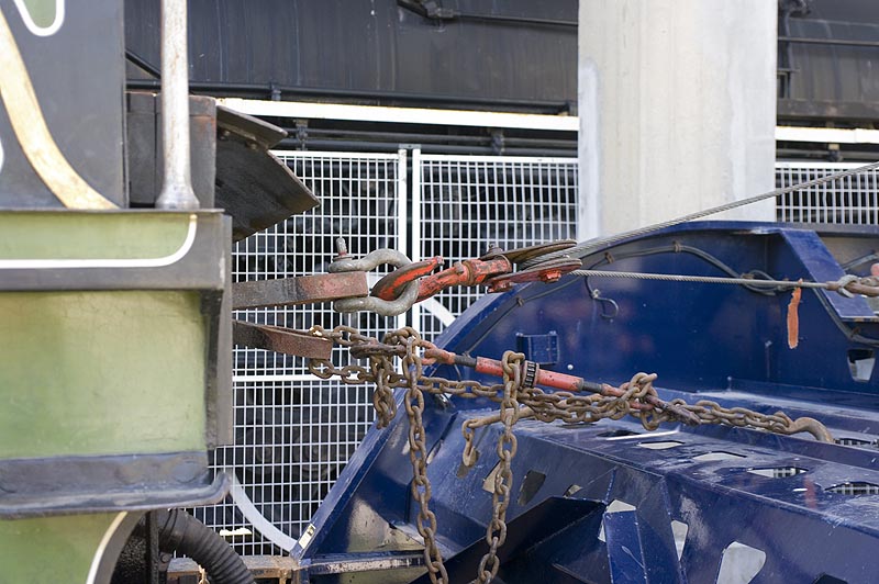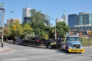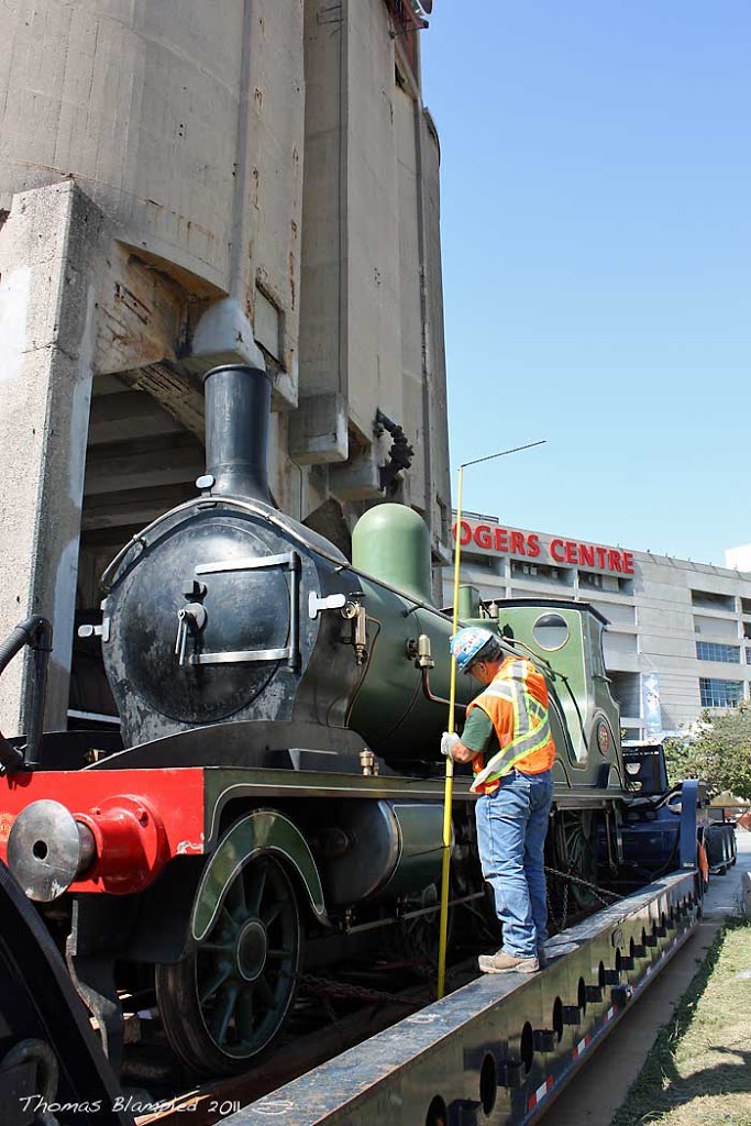 Continuing our report on the departure of the Heritage train set from the Railway Children production for the U.K., we find the Adams T3 Steam engine being tied down to the float and then finally departing Roundhouse Park with one serious police escort!