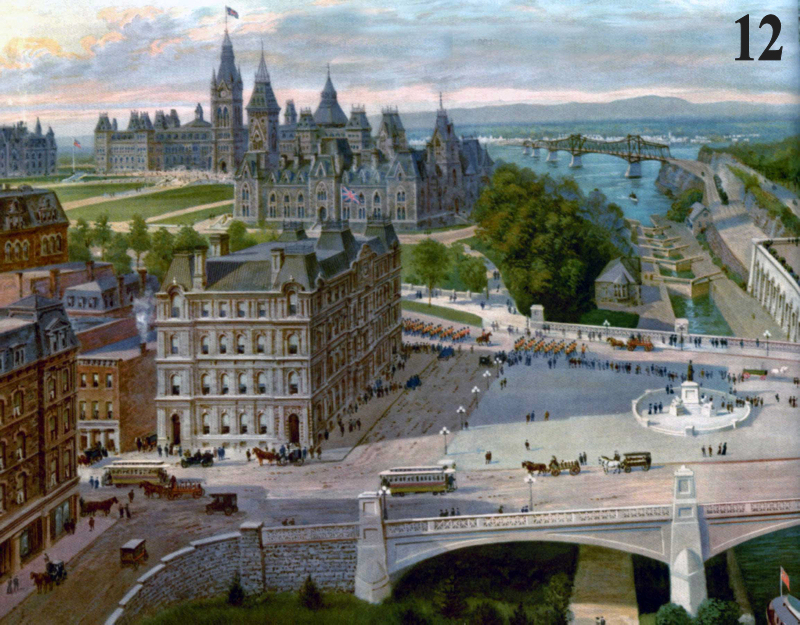 IMAGE #12 is a detail from the left side of the print. The building on the upper left on Parliament Hill is the old Centre Block that was destroyed by fire in 1916 and rebuilt in subsequent years. Moving to the right is the Parliament East Block. Further to the right and in the distance is the Alexandra Interprovincial Bridge built by the Canadian Pacific Railway and connecting Ottawa and Hull, Quebec over the Ottawa River. Moving back towards the foreground are the upper locks of the Rideau Canal. The small stone building nestled in the trees left of the waterway was the Lockmaster’s Office. The plaza has several automotive and horse-drawn vehicles.