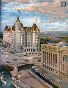 IMAGE #13 is the right side of the print and depicts its primary subject, the Chateau Laurier Hotel. Across the street is the Grand Trunk Central Station, connected to the hotel by a tunnel. Most of the tracks and the train shed are out of view on the right. The two visible tracks lead to the Interprovincial bridge seen in the previous view. In actual practice, the Grand Trunk train depicted would not have used these tracks. The tracks were used by the Canadian Pacific Railway, including the Montreal-Vancouver transcontinental flagship, The Canadian. The bridge was also used by an inter-city streetcar system, the Hull Electric Co. that terminated in a loop under the hotel until 1948. The larger steamship in the canal is the Rideau Queen.