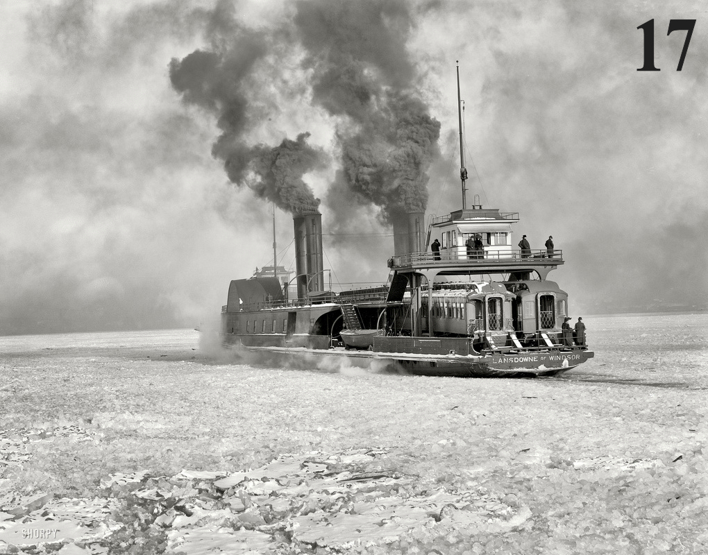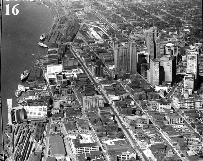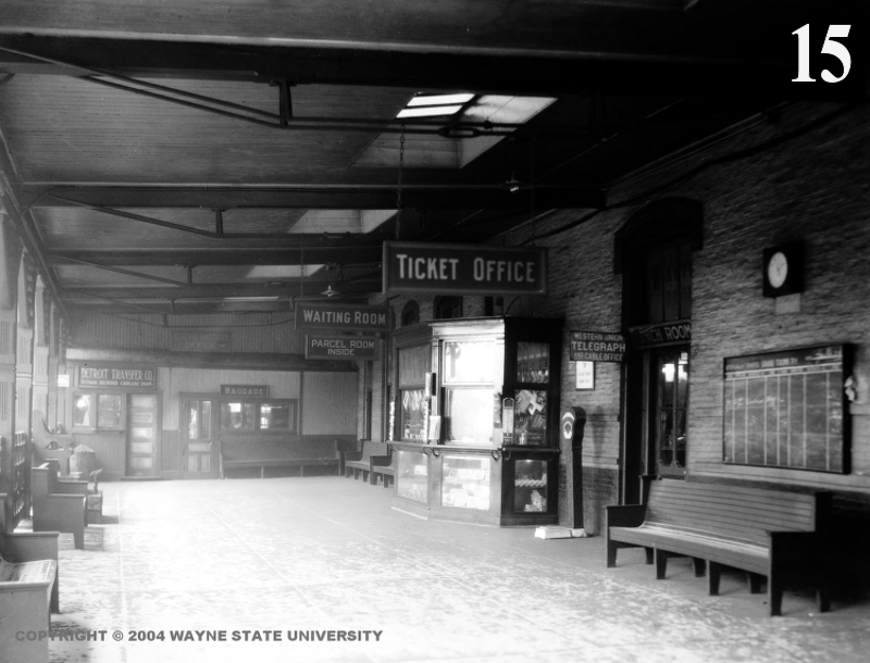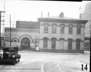 The print belonged to Mr. & Mrs. Henke, a retired couple who reside in Grand Rapids, Michigan and the sale to the TRHA was brokered by their son, Jim. Given their brief description of the print having been obtained in Detroit, my initial interpretation of its provenance was that it had hung in the Grand Trunk’s Brush Street station. (IMAGES #14 & 15) The station had been built in the 1860’s and used by the Great Western Railway of Canada. The GWR was acquired by the Grand Trunk Railway of Canada in 1882. Canadians travelling to Michigan would have been familiar with the depot since through passenger cars from Montreal and Toronto were ferried between Windsor, Ontario and Brush Street until 1955. (IMAGES #16 & 17- station on lower left)