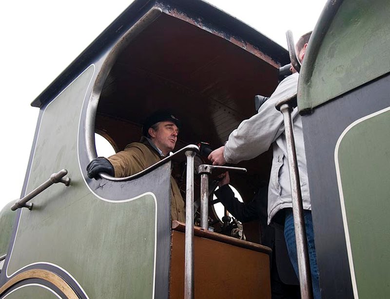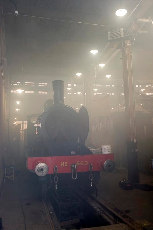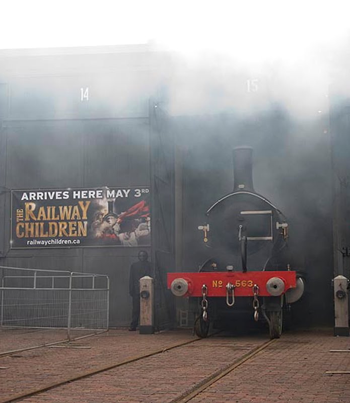 Yesterday’s press event was a great success thanks to a mix of TRHA volunteers and theatre crews working together. The theatre crew rigged up smoke generators inside the doors of stall 15 and in the smokebox of #563. They also had a sound presentation/introduction all set up to present the locomotive as she was rolled out.