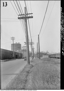 he souths was a small Canadian Pacific freight yard and sheds. IMAGE #13 is looking west along Front Street from Water Street in 1932 and a warehouse can be seen on the left. The CPR main line from the Don Branch to Union Station also passed through this property until it was relocated to the new elevated Waterfront Grade Separation in 1930, now known as the Union Station Rail Corridor. IMAGE #14 dates from February 1925 and is looking east along Front over the CPR tracks. The lower Don River had recently flooded and the crew on the right is clearing the ice and snow from the tracks. IMAGE #15 was taken the same day and is looking south along Cypress St from Eastern Ave. towards Front. Additional CPR crews can be seen on the right clearing the tracks. When flooding occurred on the lower Don, CPR trains from Montreal and Ottawa had to be rerouted through North Toronto, West Toronto and Parkdale to Union Station. The large building in both images is the William Davies Co.