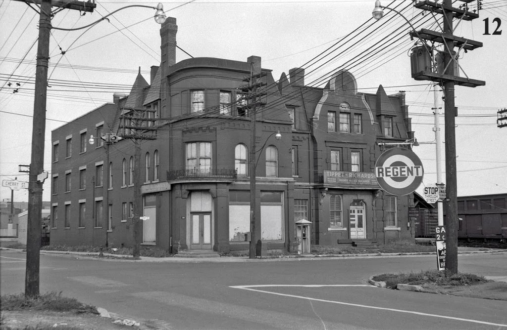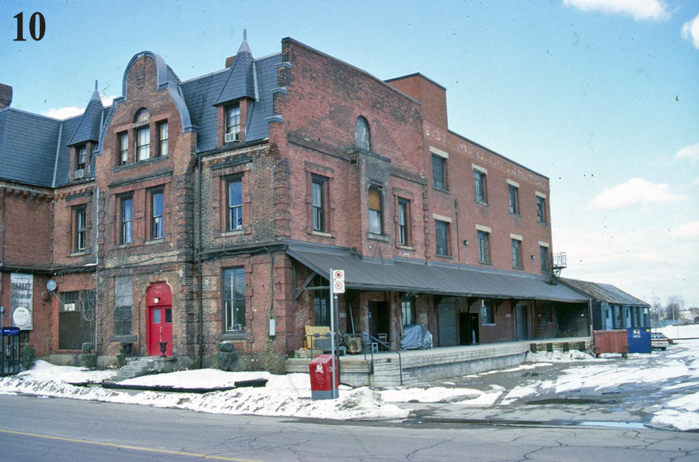 For a time, the old schoolhouse was the Thomas Davidson Manufacturing Company. The Montreal-based firm manufactured enamelled sheet metal products and in 1927 became part of General Steel Wares. Both buildings were extensively modified and enlarged over the years to suit their industrial purposes. IMAGE #11 shows the structure in 1954, when the moving company Tippet-Richardson occupied the south building and the north building was seemingly vacant. The loading dock on the south side of the building was served by a Canadian Pacific Railway siding. IMAGE #12 shows all three buildings looking north on Cherry Street and dates from 1981.