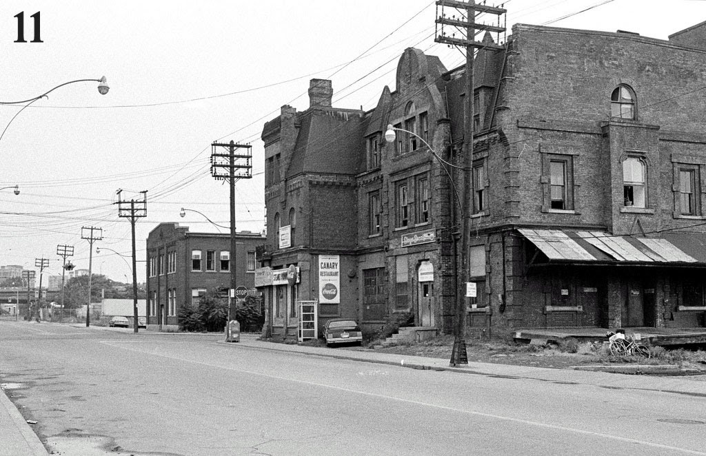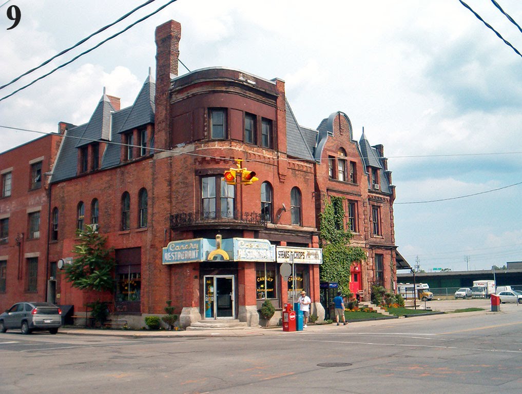 On the southeast corner of Front and Cherry streets are two attached buildings that will also be preserved. The best known of these was the Canary Restaurant on the corner, a legendary local diner that moved into the building in 1965. (IMAGE #9, photograph by James Bow, from Remembering the Canary). The building attached to the restaurant on the south is seen in IMAGE #10. This structure was originally erected in 1859 as the Palace Street School (the name of the eastern end of Front St. at the time). The school was built partly because there were some who objected to the fact that the nearby Enoch Turner Schoolhouse was too close (both physically and spiritually) to the Little Trinity Church and that boys and girls were mixed together in the same classroom. After the area became less residential and more industrial around 1890, the school moved out and the corner building was erected as a hotel, touted for its proximity to the Grand Trunk Railway’s Don Station and presumably the CPR Don Station, when that opened in 1896.