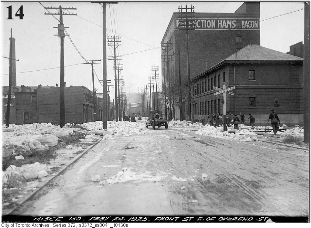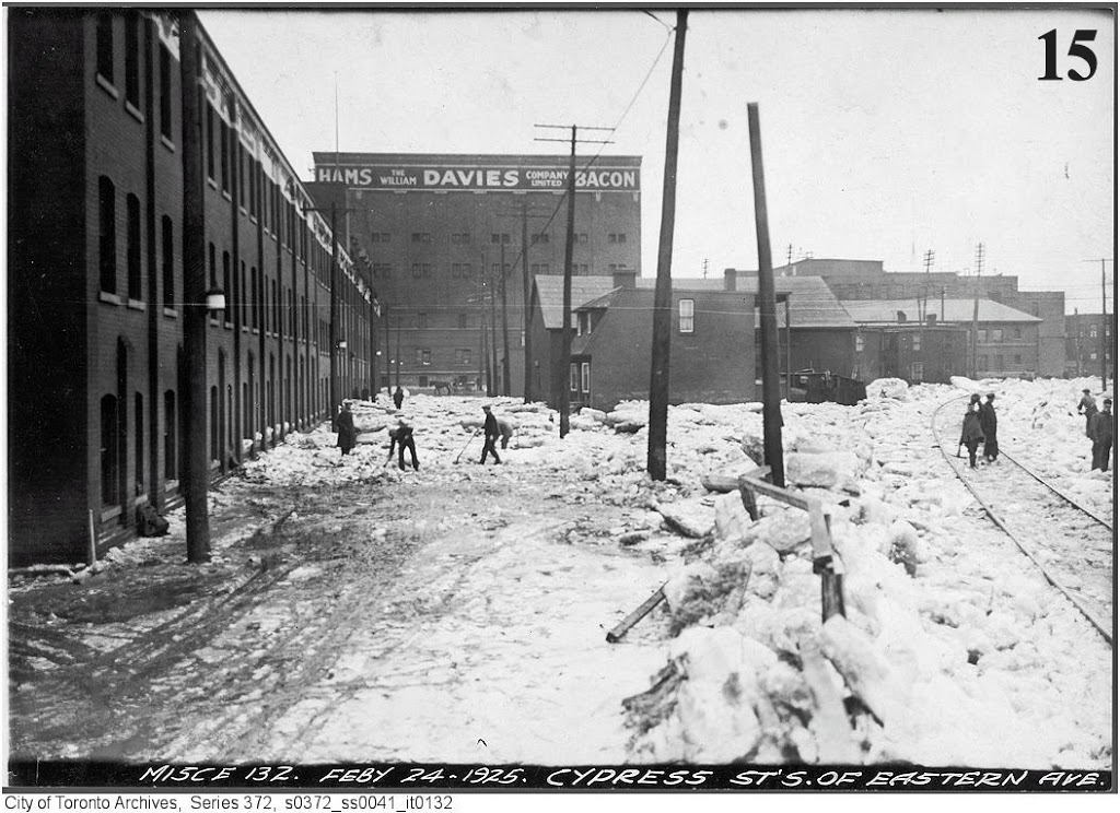 he souths was a small Canadian Pacific freight yard and sheds. IMAGE #13 is looking west along Front Street from Water Street in 1932 and a warehouse can be seen on the left. The CPR main line from the Don Branch to Union Station also passed through this property until it was relocated to the new elevated Waterfront Grade Separation in 1930, now known as the Union Station Rail Corridor. IMAGE #14 dates from February 1925 and is looking east along Front over the CPR tracks. The lower Don River had recently flooded and the crew on the right is clearing the ice and snow from the tracks. IMAGE #15 was taken the same day and is looking south along Cypress St from Eastern Ave. towards Front. Additional CPR crews can be seen on the right clearing the tracks. When flooding occurred on the lower Don, CPR trains from Montreal and Ottawa had to be rerouted through North Toronto, West Toronto and Parkdale to Union Station. The large building in both images is the William Davies Co.