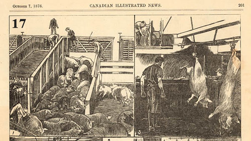 n a more fortunate note, the Davies firm introduced pea meal bacon to Canada which was first sold by the company retail outlet in St. Lawrence Market and is still a distinctive and popular uniquely Canadian snack item. Davies was also the first Canadian company to establish a national chain of food stores. Meat packing was a significant Toronto industry for the latter half of the 19th and most of the 20th century and the animals were brought into these facilities by rail. (IMAGE #17)