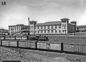 Concerns over the hygienic preparation of meat products at other smaller slaughterhouses encouraged the City of Toronto to establish the Municipal Abattoir just west of Bathurst Street in 1914. IMAGE #18 shows this facility looking north from the Fort York ramparts. The photograph is also interesting in that it shows the two types of railway cars that were essential to the meat industry. The livestock was transported into the city in the stock cars (basically ventilated boxcars) in front of the locomotive while the dressed meat was delivered in the refrigerated cars in the foreground. The abattoir was also notable in that it was located close to original location of the railway interlocking tower known as Cabin D and the abattoir building can be seen in greatly modified form above the tool s