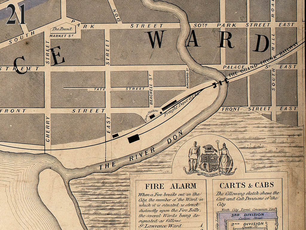 he Don Yards east of the tower are currently used for the storage and servicing of GO Transit train sets. This was originally one of the oldest railway facilities in Toronto, built by the Grand Trunk Railway in 1855. IMAGE #21 is a segment of an 1857 map of this facility, which is somewhat confusing in that Palace Street is today Front Street and Front Street on the map is today Mill Street. A locomotive shop is shown on the map as a black rectangle above the word “RIVER.” This facility was used for the final assembly of engines purchased from the Toronto Locomotive Works (TLW) at Yonge and Queen streets. Following the TLW’s labourious delivery in 1853 (http://torontorha.blogspot.com/2009/06/railways-appeared-in-toronto-in-1852.html) of the first locomotive built in Canada through the streets of the city, the GTR decided it was easier to transport the boiler and other parts separately and carry out the final assembly of locomotives closer to the actual railway tracks.