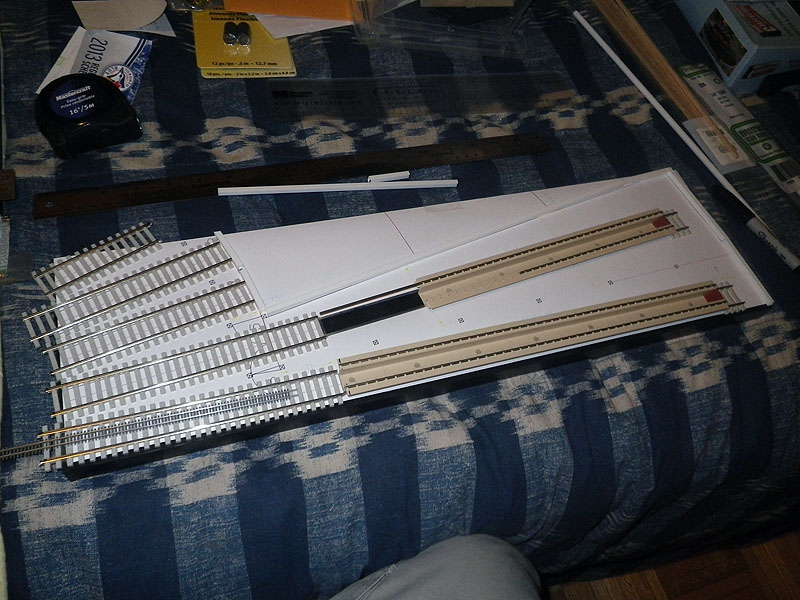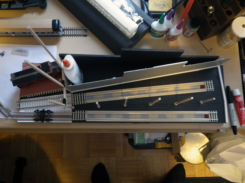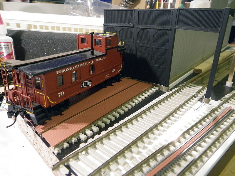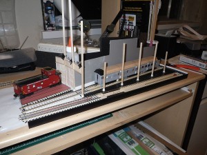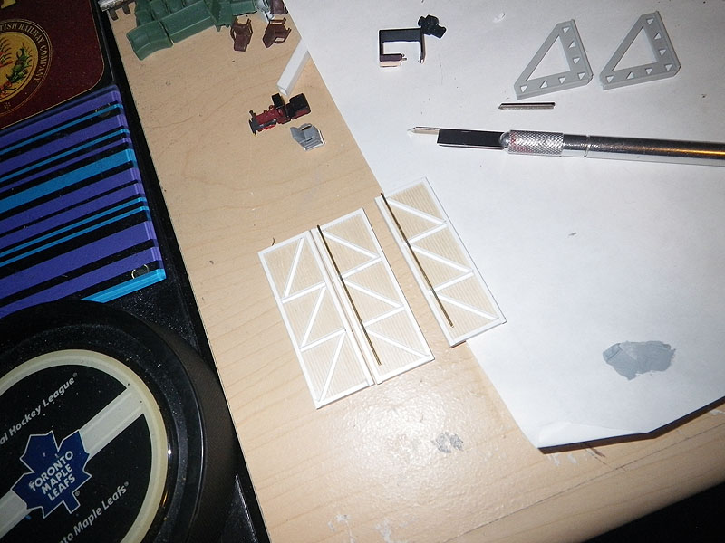 Knowing that I would be attending the Ottawa Train Expo for the TRM which is followed shortly by Doors Open Toronto and the museums busiest weekend of the year, I wanted a way to display the HO Scale Models that would give visitors to these events a sense of the models in the museum. In early March 2013, a trip to Ikea resulted in the acquisition of a spare shelf, and a project started with less than 2 months to the Ottawa show. As seen in image 3, the first step was to take a printout of the plan and start mocking up the location of track and the inspection pits inside the walls to confirm everything would fit as designed. The walls would be constructed using a variety of materials including strip basswood, styrene strips, and styrene cinder block sheets. As seen in Image 4, the stall doors were constructed with grooved basswood sheet and styrene shapes to represent the metalwork on the doors. Image 5 shows the rear walls of the stalls being formed with styrene frames, which would hold the windows and eventually be covered by Styrene Brick sheets.