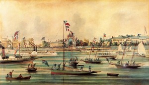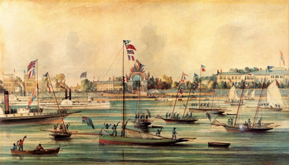 Prince Edward arrived in the city on board the Kingston, the steamship to the left of the arch. The royal visit was the most glittering social event in the quarter century history of Toronto, the first time that a member of the royal family had made an official visit to the city and when the vast majority of Torontonians were still fiercely loyal to the crown. An amphitheatre sitting thousands of people flanked the arch and also functioned as a railway station on the two occasions that HRH boarded a train during his four-day stay in Toronto.