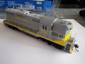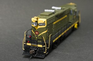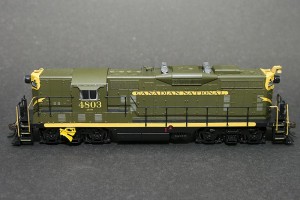 The most recent addition to the collection is a model of our unique high nose GP7 Canadian National 4803.  Bachmann has recently produced a model of the high-nose GP7, and while it is lacking in detail straight out of the box, and does not come painted for CN, it provides a good starting point to add custom details and make modifications to represent the TRM’s GP7.  After removing some of the inaccurate molded on details, commercially available parts from Miniatures by Eric, Details West and Detail Associates were added to provide the correct pilots, ladders, lights, horns, bell and MU Cables/air lines.  With a fresh coat of CN Green 11 and decals, it becomes a very close match for the real 4803.  The photo at the upper left shows the model as it came out of the box and next two photos show the finished model.