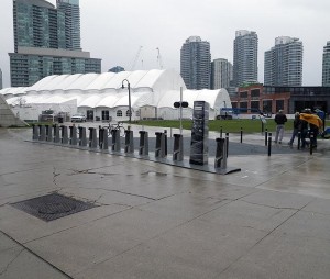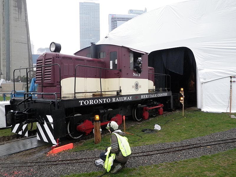 In the pictures below, we watch the safety stops being tested with the Whitcomb #1. These are designed to automatically apply the train brakes should the engine proceed too far into the stage area. We also see the white picket fence which is erected during the show to allow the train unimpeded access during its several excursions into the theatre during the show. In the final picture at the lower right, a bicycle rental service system has been installed on the north edge of Roundhouse Park.
