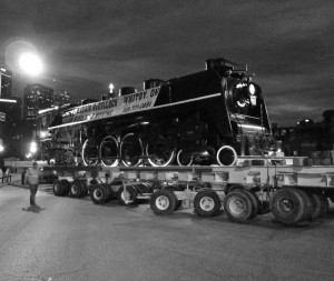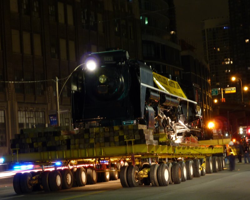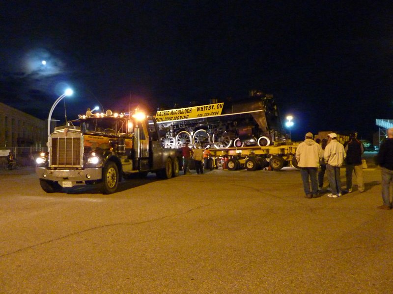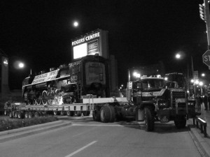 In the picture at lower left, we find the massive tow truck used in the move, lifting the front bogies back onto a trailer at Rees Street. The front and rear bogies were only used on the bridged section as their existence would have made turns much more complex. In the middle photo below, we find the rig making another difficult turn at the intersection of Rees Street and Bremner Boulevard in front of the Rogers Centre. Here a centre median in the middle of Bremner left a narrow path just wide enough for the rig. At this corner, the moving crew had to jack up the trailer, turn the bogies about 45 degrees and then use the tow truck’s winch to pull the trailer sideways to line it up for the trip down Bremner. In the middle picture, you can see the bogies in this position. Ater this was done, 6213 made an easy trip along Bremner Boulevard as the sun rose and then made a quick turn into Roundhouse Park. The whole rig now rests straddling one of the radial tracks in the park. In a few days the moving crew will carefully align the trailer with the track, remove the bogies, drop down the platform and winch the engine onto the radial track.
