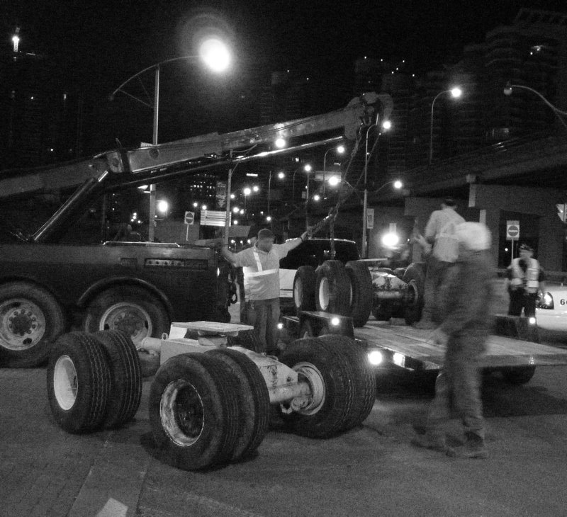 At the upper left, we find the rig at about 12:30 a.m. making a very difficult U-Turn out of the CNE parking lot onto Newfoundland Drive. This took a couple of hours and put us behind schedule. In the middle picture above, we find 6213 moving down Lakeshore Road. Things moved much more quickly and 6213 easily made up time against the schedule. Just beyond Bathurst Street, a “time out” was called to add two more bogies to the front and to lower two bogies at the back providing 32 more wheels under 6213 for a total of 80 wheels on the ground. The extra wheels were necessary in order to improve the load distribution as the rig went over the bridged section of the Westbound Lakeshore Road just west of Rees Street. In the picture at the upper right, we see 6213 safely leaving the bridged section without any mishaps.