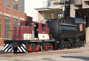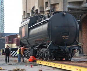In the two pictures at the above left (taken by Michael Guy), we find #6213 moving through the Princes’ Gates and the renowned photographer Norm Betts capturing the event. In the next picture (taken by Lance Gleich), the tender passes Bathurst Street on Lakeshore Road and takes aim at the CN Tower. In the final sequence of pictures below (also taken by Lance Gleich), the tender is offloaded at Roundhouse Park and our CLC Whitcomb locomotive put to work pulling it onto the turntable as the sun rises in the wee hours of the morning.