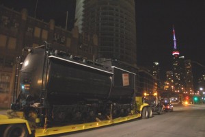 In the two pictures at the above left (taken by Michael Guy), we find #6213 moving through the Princes’ Gates and the renowned photographer Norm Betts capturing the event. In the next picture (taken by Lance Gleich), the tender passes Bathurst Street on Lakeshore Road and takes aim at the CN Tower. In the final sequence of pictures below (also taken by Lance Gleich), the tender is offloaded at Roundhouse Park and our CLC Whitcomb locomotive put to work pulling it onto the turntable as the sun rises in the wee hours of the morning.