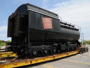 This week, 6213’s tender was rolled out of the fenced compound it has occupied at Exhibition Place since 1960 and onto a special rail equipped float for transport to the roundhouse. The locomotive itself will be loaded next week and will ride to the roundhouse atop a float custom-built for the purpose by Laurie McCulloch Movers.