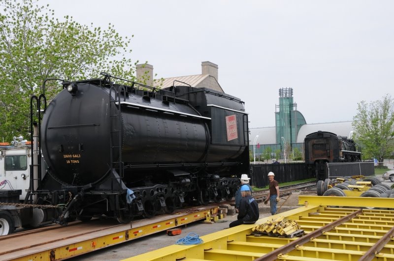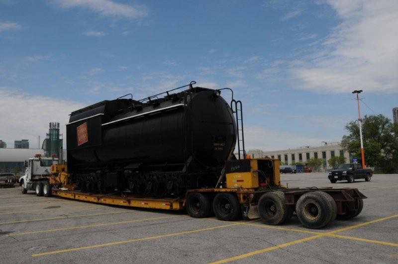 This week, 6213’s tender was rolled out of the fenced compound it has occupied at Exhibition Place since 1960 and onto a special rail equipped float for transport to the roundhouse. The locomotive itself will be loaded next week and will ride to the roundhouse atop a float custom-built for the purpose by Laurie McCulloch Movers.