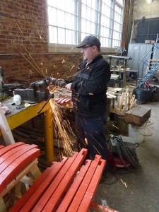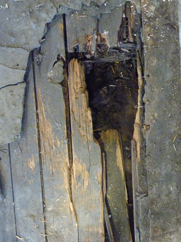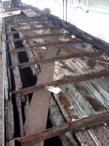 - Tom Murison and his crew have finished stripping the Cape Race’s old roof and are now working on rebuilding the wooden roof components while our volunteers worked at disposing of the old roofing materials and began the job of painting the steel infrastructure. Tom showed us the redwood that was used in the original roof construction. Redwood is very susceptible to dry rot if moisture gets into the wood. Over the years, this moisture resulted in extensive damage to the roof of the Cape Race forcing us to replace almost all of it.