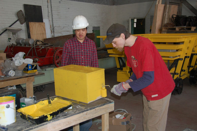 The power box for the speeder car drumhead was painted bright yellow as we see in the picture above. Jon continued to paint components of the miniature locomotive while Arno focussed on reassembling the locomotive as shown in the above picture.