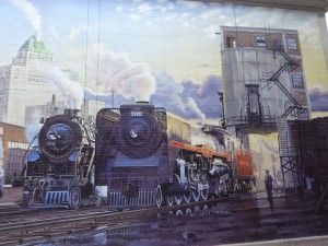 In this seres of pictures, we get successively closer looks at the mural on the wall of the pedestrian entrance to the Metro Convention Centre underground parking garage. As reported before, this mural is a reproduction of a painting by David O. Oram. His work can be found on David’s website as well as on the TRHA website and in the main foyer of Leon’s.