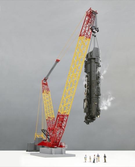 Technically, the sculpture is described an “operational replica of 1943 Baldwin 2900 class steam locomotive in stainless steel and aluminum and includes a 160 x 141 x 29 foot Liebherr LR 1750 lattice boom crane.”