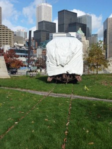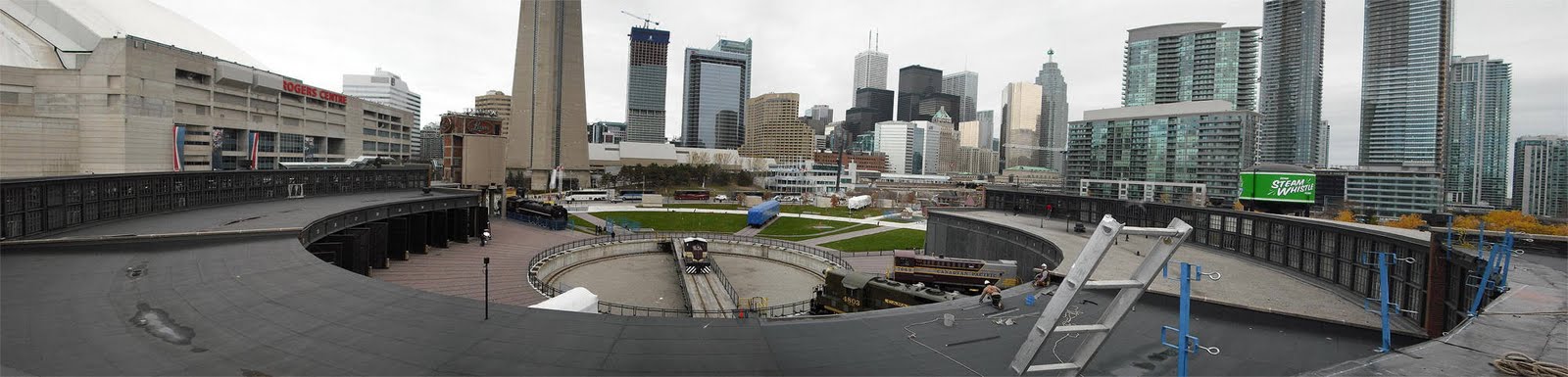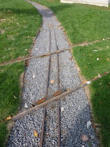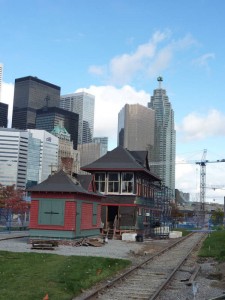 In today’s posting we feature a panoramic photo of Roundhouse Park from the roof of the Roundhouse by Stephen Gardiner. In this shot, it is clear that some of the radial tracks for the storage of our railway engines are ballasted as per normal railway practice but others as can bee seen in the pictures below are set into the grass for aesthetic reasons. As you can see, the only evidence of the rails are the rows of leaves caught on top of each of the rails. Also clearly shown in these pictures are the very unique railway crossings so prevalent in Roundhouse Park with a standard gauge railway crossing a 7 1/2″ gauge miniature railway at multiple points. In the final shot below, we see one the standard radial tracks passing Cabin D and its tool shed with these being positioned against the constantly changing skyline of the City of Toronto.
