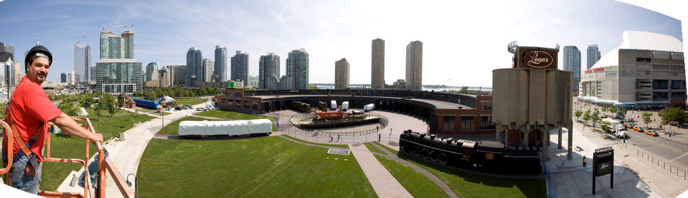 Norm Betts, the professional photographer who has been documenting the development of Roundhouse Park in photos, has sent this great panoramic shot of Roundhouse Park now that the laying of the sod has pretty much been completed and with it the reconstruction sof the park’s grounds. As we sweep from left to right, we see: