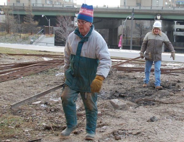 Then, on Saturday, December 13th, a rail moving crew consisting of four teams of two TRHA volunteers each worked with one man at each end of a rail section. The exact weight remains to be calculated but at the nominal quantity of ten tons, we each moved a ton and a half of steel this morning and still made it home in time for brunch. A job well done!