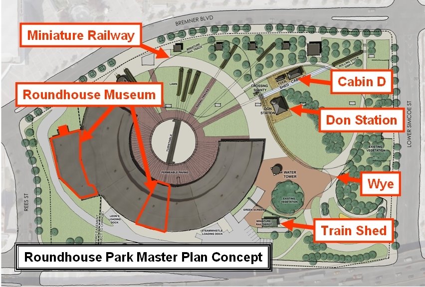 In an earlier posting called Roundhouse Park from Above! – Part 1 of 2: Googling It! we introduced you to the Google Maps’ satellite view of the Roundhouse Park. Google Map has recently updated their aerial view of the Roundhouse Park area. The images above are the latest views. Note in the close up view at the right, that the Master Park Plan appears almost entirely implemented (see the Park Plan below). The only obviously visible missing part is the green grass to the north of the turntable. This image was likely captured earlier in the fall of 2009.