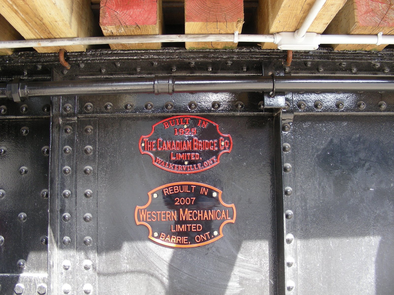 Traditionally, builders plates have been attached to locomotives which serve to provide key information about the locomotive, its builder and when it was built. In the pictures above we find first the original builder’s plate for our 120 foot turntable which was removed and repainted by Western Mechanical during the restoration of the turntable bridge. Western Mechanical also produced a matching builder’s plate to document the rebuilding as shown in the second picture above. The third picture shows the two builders plates attached to the turntable today.