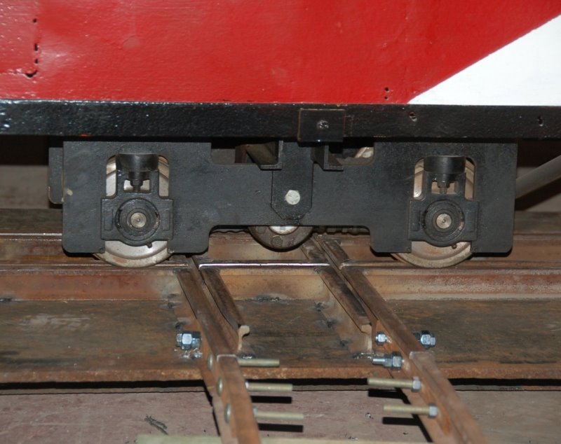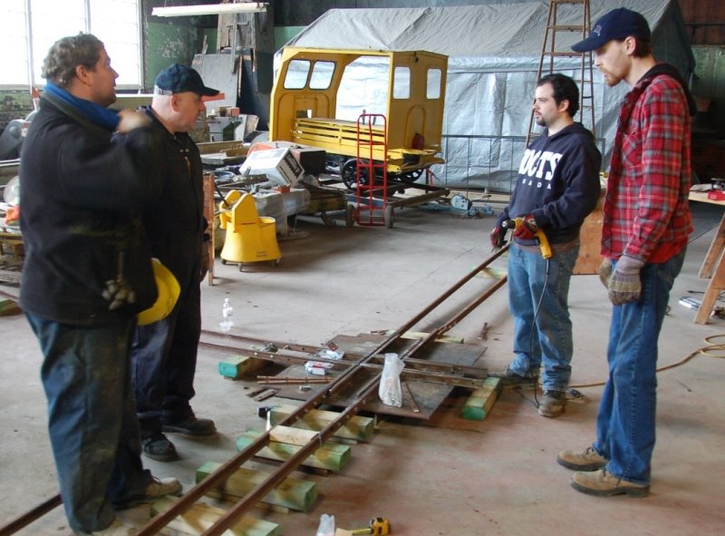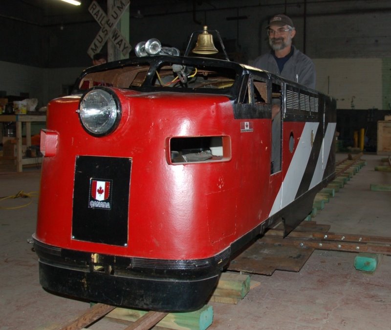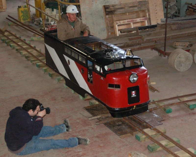 After completing the work described yesterday and a well earned lunch break, all hands engaged in miniature track building. As shown in an earlier posting here, the miniature railway will operate on a track in a “figure 8” configuration requiring the construction of a crossing. This was completed and the new crossing is now on the floor with twenty feet of track on either side of it. This is a trial assembly to prove our assembly methods and check the crossing. We tested the crossing with our big miniature “CN” F7 diesel locomotive.