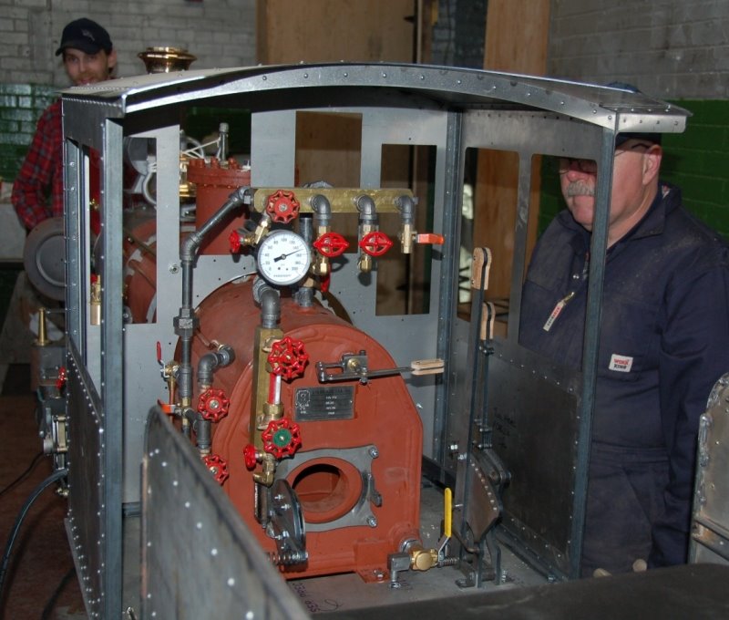 In the pictures above, we see Michael G. and Michael S. adjusting items in the cab and the pressure gauge reading 150 pounds per square inch. We also have a great view of the backhead controls with the cab in place.