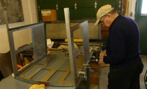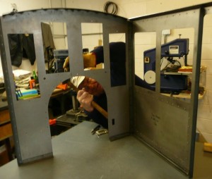 Now that the Burlington based team has completed their work on the steam engine’s tender, they have been working on assembling the cab which is now almost nearly complete. In the above pictures we find Pat in action fastening the cab sides to spectacle plate. This work should be finished tomorrow. At that time, the tender and the cab will be sent out for painting using a powder coating process.