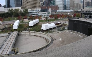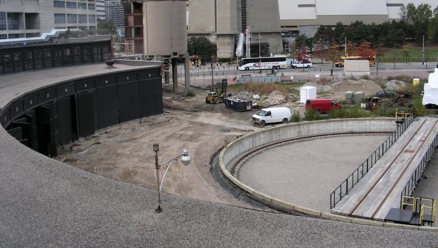 Here is a view of roundhouse park that we haven’t seen for quite a while. You can see the “shrink-wrapped” rolling stock clearly and the prepared areas between the turntable pit and the roundhouse.