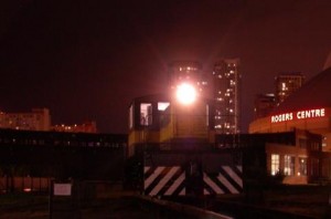 At the left, we see the Whitcomb diesel with newly installed lighting in action in a night shot. This was done early in support of the recent and widly successful Toronto-wide “nuit blanche” celebration. One of the many “nuit blanche” events was held in the roundhouse area.