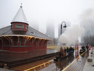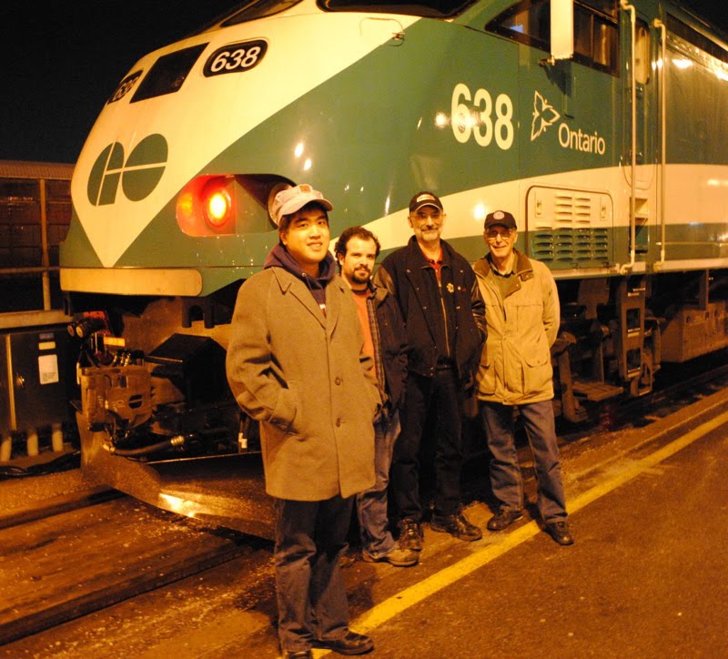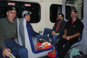 A number of our volunteers organized to celebrate by taking advantage of the free fares after 7:00 p.m. on GO Transit on New Year’s Eve. Given the resulting flexibility of hopping on and off at will, members joined the group at locations along the line which were most convenient to them and the group developed an itinerary to take maximum advantage of the schedules on the Lakeshore line . In the pictures at the left and middle above, we find the group enjoying the fine ride provided by GO Transit.