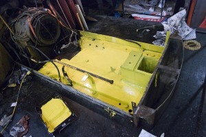 “Michael Guy and I completed scraping and cleaning out as much of the accumulated sludge in the #1’s engine bay as we could. Then we moved on to preparing it for paint, wiping down the surfaces and cutting away some un-needed brackets and mounts within the engine bay to make future maintenance easier when the engine is re-installed. The cleaned engine bay is shown in the image at the upper left.