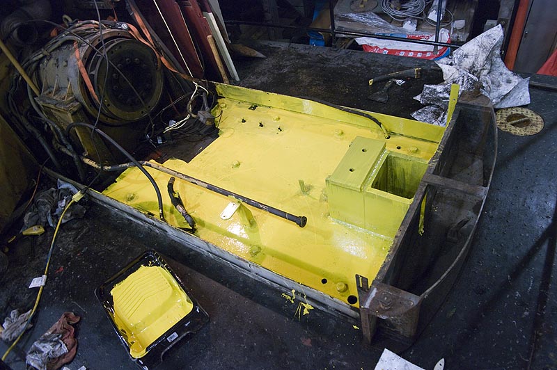 We then had a debate over which garish shade to paint the bay. Given that it appears it was yellow before, and that the bright yellow will show up any future smudge and leaks to allow us to spot them, we went with the lovely Tremclad yellow shown in the image below.