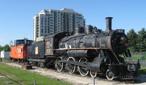 As reported in the Barrie Examiner (http://www.barrieadvance.com/barrieadvance/article/114015): “Built in Quebec, this 1910 steam engine was used by CN Railway until the late 1950s; it was stationed in Allandale and served many Simcoe County communities. Donated by CN to the city in 1960, the engine has been on Lakeshore Drive ever since. A high fence was eventually erected to protect the artifact from vandalism and graffiti. The caboose was added in 1995.”