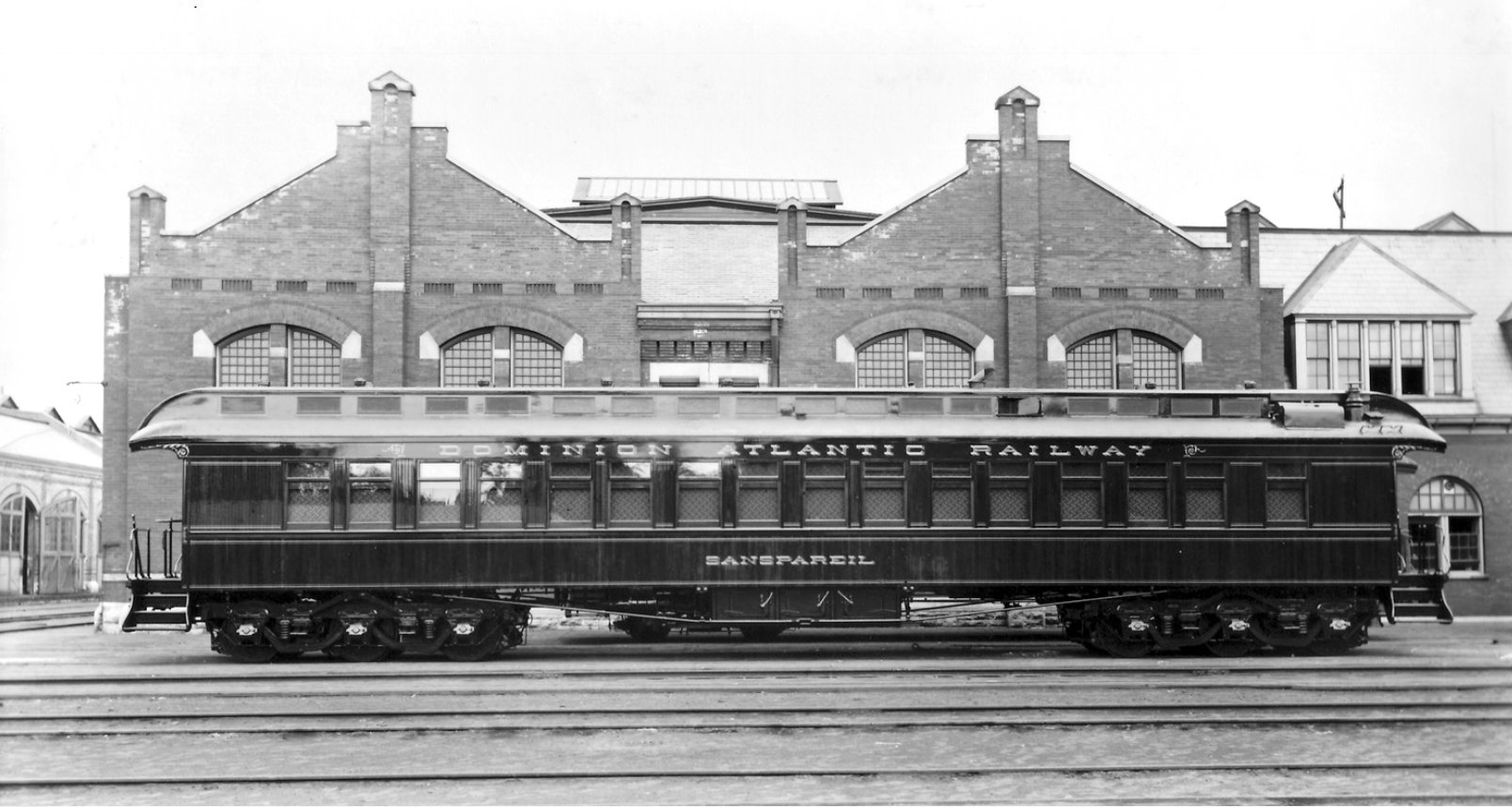 Nova Scotia is a parlour car that was built as Sans Pareil (French for “incomparable” or “without equal”) for the Dominion Atlantic Railway in 1896. It was manufactured by the Pullman Company near Chicago at a cost of $11,972. It was frequently used to transport passengers on the Flying Bluenose, a passenger train which used to run between Yarmouth and Halifax in the province of Nova Scotia. The train was named after Canada’s most famous racing schooner. Many of the passengers on board the train were tourists who had come to Yarmouth from Boston and New York on company-owned Dominion Atlantic and Eastern Line steamships. Package tours were provided by the railway to enable Americans to explore the scenic highlights of the province. The Dominion Atlantic Railway was leased by the Canadian Pacific Railway in 1911 and was operated as a subsidiary from that point onward. One year later, the Sans Pareil parlour car was renamed Nova Scotia and it was converted into a business car for railway officials.