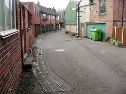“There is a 7 1/4″ gauge railway in Shrewsbury, very close to the old Abbey station off Abbey Foregate in the U.K. The track is still in situ (probably not worth the bother of lifting it!) but the line is no longer used. The track is 7 1/4″ gauge and was used to move freight around the yard. Whilst it appears to be on a public road it probably isn’t, it’s more like a paved back alleyway. I haven’t been able to find out when the line closed, but I would imagine 10 to 20 years ago. There were two locos used, a diesel outline and a steam loco. Both were miniature versions of full size locos. It appears the chief product handled was sugar. The line went into one or two buildings. Length was in the region of 300-400 metres going by the map (below). It’s likely that the track in the buildings has been lifted. The line had several unusual if not unique features. It seems to have been used for freight only, it ran mainly on-street and is still there!”