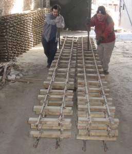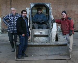 At the above left, we see the team of Russ M., Dan G., Michael G. and Dave W. who assembled last Saturday at 9:45 a.m. to pretty much complete the salvaging of artefacts and other useful materials before the area is emptied by the restoration company. In the middle photo, the TRHA’s inventory of 7 1/4″ miniature railway trck is being moved from the area under renovation to the safety of another part of the roundhouse. At the right, we see that the newly opened up space has been pretty much cleared out of materials and debris at this point.